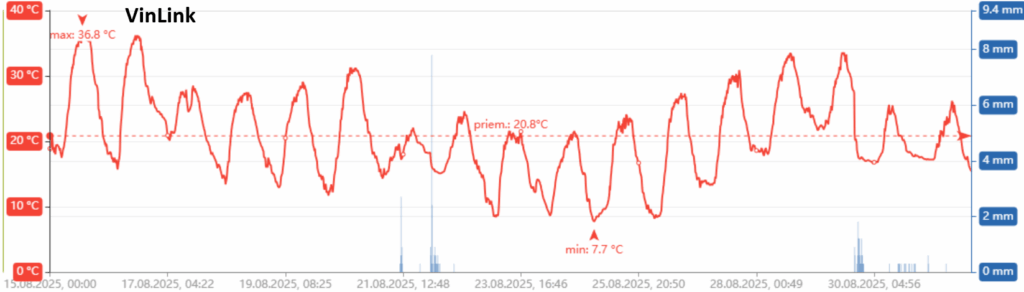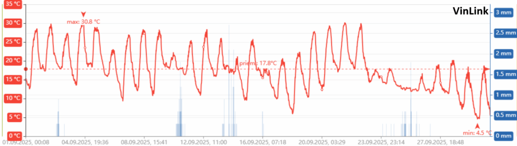 Bola to pomerne náročná kampaň. Počas záverečného dozrievania hrozna, konkrétne od 15.8.2025 do 30.9.2025, spadlo spolu až 98,0 mm zrážok (41 mm v auguste a 57 mm v septembri). Táto zrážková činnosť sa prejavila v samotnom hrozne.